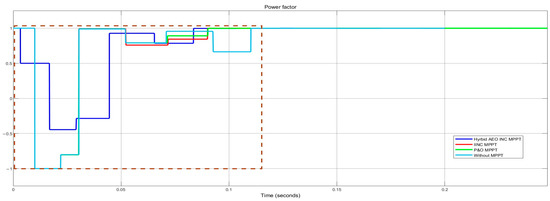 Results of the power factor of the grid system at varying irradiance conditions have been depicted in Figure 17. The system’s power factor is maintained in the range of 0.996 to 0.999. Figure 18 illustrates the total harmonic distortion of grid current at varying irradiance conditions. The THD of grid current is attained below 5% and follows the IEEE standard.