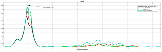 Plot of THD of the grid current vs. time for varying irradiance conditions.