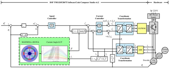 19], an MTPA control with nonlinear simultaneous equations was derived from the Lagrange multiplier method, which could be solved by numerical algorithms. The MTPA control technology enables the production of equivalent torque with minimal current. It achieves this by identifying the ideal current angle that maximizes output torque at a given stator current while also minimizing copper loss during the process. However, PMASynRM has inherent drawbacks, such as nonlinear and time-varying control characteristics, which make achieving high-performance servo applications and the traditional MTPA quite challenging [