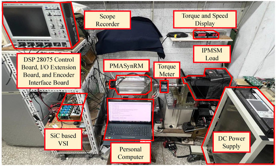 Figure 10, comprises various components such as the PMASynRM servo drive, DSP TMS320F28075 board, and a SiC-based VSI with 4.5 kW. An industrial 7.5-kW PMSM drive is operated in torque control mode as the load. Moreover, two load torques 10 Nm (case 1) and 20 Nm (case 2), are set in the experimentation. The control of position and speed of the PMASynRM is determined using an incremental encoder, which interfaces with a quadrature encoder pulse (QEP) interface and has a sampling interval of 1 ms. The control of current operates with a sampling interval of 0.1 ms. The PMASynRM servo drive is then controlled by delivering switching commands for space vector pulse width modulation (SVPWM) to the voltage source inverter (VSI).