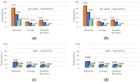 Figure 16, considering two operating cases with periodical steps and sinusoid reference commands. The proposed IBSCRWFNN position controller exhibits lower maximum, average, and standard deviation tracking errors thanks to its faster convergence rate and improved generalization performance.