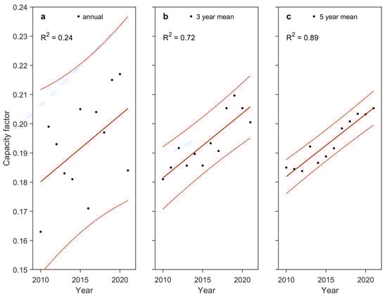 National capacity factor (CF) in 2010–2021 (black circles) in terms of (a) annual mean; (b) 3-year mean; and (c) 5-year mean, including the linear trends (red line) with confidence intervals (dotted red line) and the coefficients of determination (R2).