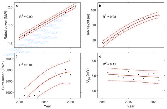 Annual courses (black circles) with fitted polynomials (red line) including their 90% prediction bounds (dotted red line) of mean (a) rated power (Pr); (b) hub height (hhub); (c) curtailed wind energy (CUE); (d) wind speed at 90 m (U90). The coefficients of determination (R2) are displayed for the fitted polynomials.
