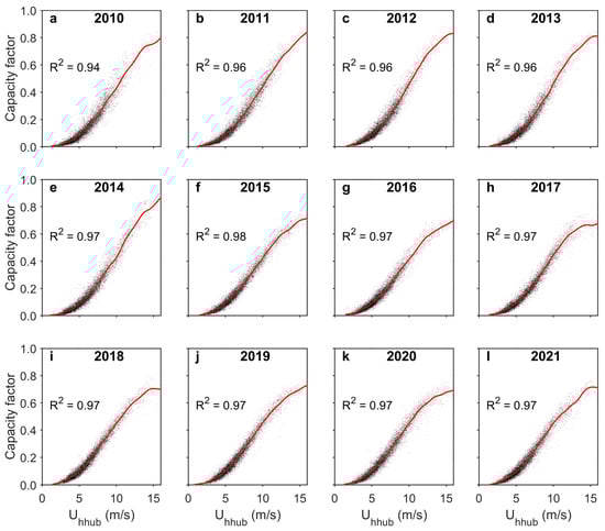 National capacity factor (CF) as a function of wind speed at hub height (Uhhub) in (a) 2010; (b) 2011; (c) 2012; (d) 2013; (e) 2014; (f) 2015; (g) 2016; (h) 2017; (i) 2018; (j) 2019; (k) 2020; (l) 2021. The coefficients of determination (R2) are displayed for the fitted smoothing splines.