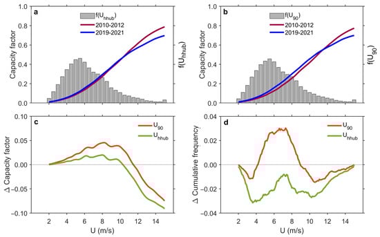 We calculated the difference between the CF in 2019–2021 and 2010–2012 (ΔCF) as a function of wind speed classes for U90 and Uhhub. When ΔCF > 0, the CF for a given wind speed class has increased between the first and second period. When ΔCF < 0, the CF for a given wind speed class has decreased between the first and second period. Thus, ΔCF was used to analyze for which U classes the increase in the CF is mainly due.