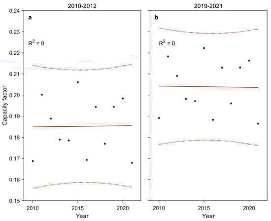 Annual mean national capacity factor (CF) in 2010–2021 (black circles) assuming conditions as in (a) 2010–2012; (b) 2019–2021. The coefficients of determination (R2) are shown for the fitted first degree polynomials (red line), which are presented with 90% confidence intervals (dotted red line).