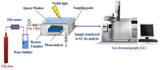 The photocatalytic CO2 reduction process was carried out using a gas-phase photo-reactor with a photocatalytic set-up as illustrated in Figure 2. A 300 W xenon lamp fitted with a reflector was used as a visible light source with a light intensity of 100 Wm−2. The prepared photocatalysts were placed inside the photoreactor chamber. The whole system was purged with N2 gas before any reactions to remove any trace gases and impurities. Then a decidedly purified CO2 gas (99.99%) has been passed through the water bubbler at room temperature and to the reaction chamber maintaining a flow rate of 50 mL min−1 until a pressure of 100 kPa was attained. The lamp was switched on to start the photoreduction process at room temperature and after 4 h of light irradiation, a gas product sample was collected for every 1h intervals and analyzed by using a gas chromatograph (AGILENT, Model: 7890A) equipped with a 25 m capillary column (AGILENT, PoraPLOT) and a flame ionization detector (AGILENT, Model: 7890A) for the detection of CH4 gas. However, the production rate of CH4 gas was calculated using Equation (1), as described in previous studies [46,47].