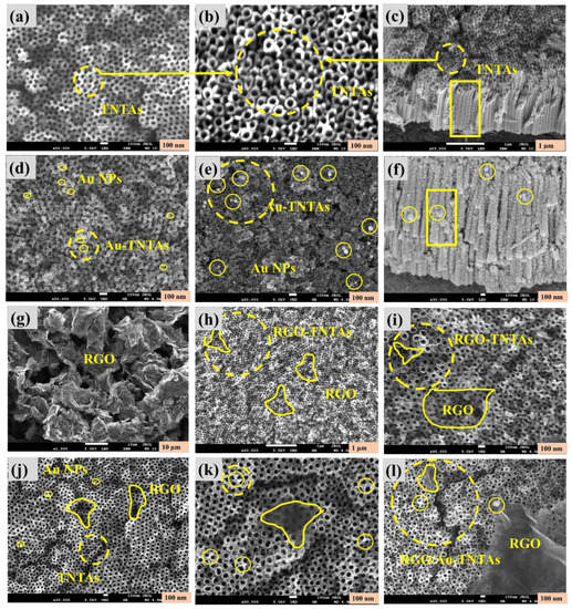 FESEM images of (a,b) Pure TNTAs at different magnifications (c) Cross-sectional view of pure TNTAs, (d,e) Surface view of Au-TNTAs composite (f) Cross-sectional view of Au-TNTAs composite, (g) Pure RGO surface, (h,i) RGO-TNTAs at different magnification and (j–l) Surface view of RGO/Au-TNTAs composite at different magnification.