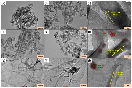 To provide additional evidence of the existence of Au NPs and RGO in the inner space of the TNTAs, all of the prepared samples were examined by the HR-TEM. The HR-TEM images of TNTAs, Au-TNTAs and RGO/Au-TNTAs are presented in Figure 4a–i. Figure 4c reveals the lattice fringe of pure TNTAs by exhibiting a d-spacing of 0.35 nm, corresponding to the plane (101) of TiO2 anatase phase (DB card number 7206075). Similar d-spacing values of 0.35 nm for TNTAs wall surface were also reported by Sim et al. [56], Goddeti et al. [57], and Zubair et al. [47]. Au NPs were homogeneously distributed in the TNTAs and deposited inside the nanotubes as shown in Figure 4f. However, the interlayer spacing of 0.24 nm can be indexed to the Au (111) lattice plane (DB card number 9008463). In this work, RGO incorporation with the Au-TNTAs has been reported for the first time to improve the photocatalytic CO2 reduction performance. The transparent RGO nanosheet was obvious in Figure 4g,h. After the incorporation of Au NPs and RGO into TNTAs, the lattice fringes of TNTAs and Au NPs in the ternary RGO/Au-TNTAs composite exhibited the same results obtained with the pure TNTAs and Au-TNTAs samples. These observations were also conceding with the next XRD results.