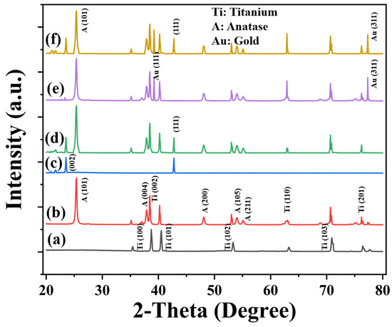 XRD patterns of the (a) Unannealed-TNTAs, (b) Annealed-TNTs, (c) Bare RGO, (d) RGO-TNTs, (e) Au-TNTAs and (f) RGO/Au-TNTAs.
