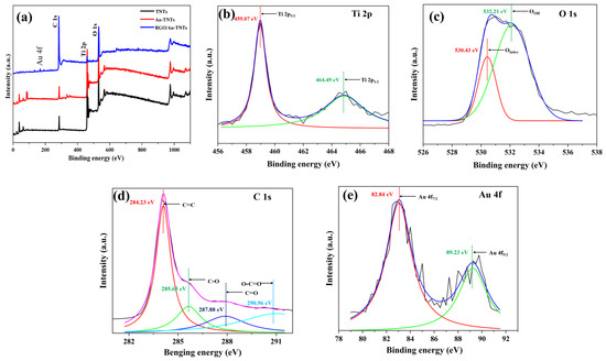 To obtain more detailed information regarding the elemental state and chemical composition of the RGO/Au-TNTAs composite, XPS analysis was performed and depicted in Figure 7. As shown in Figure 7a, the XPS spectra over the prepared TNTAs, Au–TNATs, and RGO/Au–TNTAs samples confirmed the presence of compositional elements (Ti, C, O, Au). The XPS analysis of individual TNTAs, Au–TNTAs and RGO–TNTAs has been provided in supplementary information (see Figures S2–S4). The binding energies of Ti 2p (Figure 7b) in RGO/Au–TNTAs were detected at two identical peaks of 459.07 eV (Ti 2p3/2) and 464.49 eV (Ti 2p1/2) which are consistent with the previously reported studies [25,66]. It is worth mentioning that the separation of two peaks of Ti 2p spectra was found at 5.42 eV which confirmed the Ti4+ state of anatase TiO2 [25,47,66]. The O 1s XPS spectrum can be fitted by two chemical states at 530.43 eV and 532.21 eV (Figure 7c). The binding energy peak at 530.43 eV can be ascribed to the Ti-O bond (O lattice), whereas the peak at 532.21 eV corresponds to the oxygen vacancies [25,49]. The C 1s XPS spectra of RGO/Au-TNTAs are presented in Figure 7d and its de-convolution results in four identical peaks located at 284.23, 285.65, 287.88, and 290.96 eV which are attributed to the sp2 hybridized carbon (C=C), epoxy and hydroxyl (C-O), carbonyl (C=O) and carboxylic (O-C=O) groups, respectively. These functional groups suggest that C-O-Ti bonds may be formed when the O-H groups on the TiO2 surface contact with the carboxyl (COOH) group on RGO [25,67]. The binding energies of Au 4f at 82.84 eV and 89.23 eV are associated with the standard Au 4f7/2 and Au 4f5/2 peaks, as portrayed in Figure 7e. The fact that they can be effectively attributed to the Au0 loaded on TiO2 and Au NPs are synthesized on the surface of TNTAs in a state of metal [62,68]. Therefore, the XPS analysis revealed that the oxygen vacancy, Ti4+ state, and Au0 donor state are stable in the anatase lattice and functioning as the prevailing defect. Consequently, this defect state and the LSPR effect of Au NPs in the ternary composite may narrow the bandgap and shift the optical absorption to the visible light range [56,66].