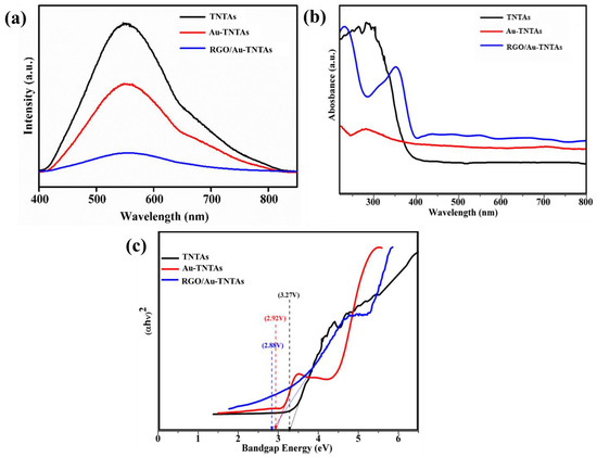 (a) PL spectra of pure TNTAs, Au-TNTAs, and RGO/Au-TNTAs, (b) UV–vis absorption spectra of pure TNTAs, Au-TNTAs, and RGO/Au-TNTAs and (c) Tauc plots of pure TNTAs, Au-TNTAs and RGO/Au-TNTAs.
