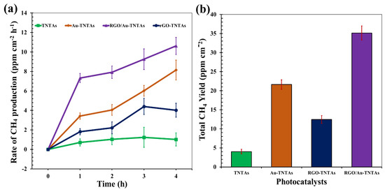 The photocatalytic performance of pure TNTAs and modified TNTAs (Au-TNTAs, RGO-TNTAs, and RGO-Au-TNTAs) photocatalysts were assessed for the photocatalytic CO2 reduction with H2O vapor into CH4 under visible light irradiation. This study only focused on CH4 production, though other value-added chemicals were also generated during the CO2 reduction process which is one of the shortcomings of the present study. The photo-reduction experiments were conducted in a fixed-bed gas-phase photoreactor. For quality assurance reasons, a series of control tests were run under different conditions (in the absence of photocatalyst, by using N2 gas as feed, and by performing reactions in the dark) prior to any experiments to ensure that the products were not generated from the photocatalysts themselves or any other additional side reactions. However, no hydrocarbon products were detected during all control experiments. The rate of CO2 photoreduction to CH4 was monitored by collecting samples from the reactor at 1 h intervals and analyzing them using GC-FID. Figure 9a and Table S1, present the photocatalytic production rates of CH4 over different photocatalysts at different irradiation times. After 4 h of light irradiation, the pure TNTAs photocatalyst exhibited the lowest CH4 production rate of 1.24 ppm cm−2 h−1. This could be explained on the base that the TiO2 material is known to be insensitive to visible light due to its comparatively wide range of band gaps. However, after doping the TNTAs with RGO, the transfer of electrons was promoted, thus enhancing the CH4 yield up to 4.41 ppm cm−2 h−1. The incorporation with RGO has also reduced the charge recombination rate of TNTAs as it has 2D and planar π-conjugation nanostructure, making it an effective electron-conductive material [72,73,74]. Moreover, the RGO nanosheets provide a quick pathway for trapping the photoinduced electrons and suppressing the charge carriers’ recombination. The Au-TNTAs displayed a notable improvement with a CH4 production of 8.15 ppm cm−2 h−1. The loading of Au NPs into TNTAs has contributed much to generating a higher rate of electrons for enhancing the CO2 photoreduction activity, owing to the LSPR characteristic of Au NPs [75,76]. Compared to all tested photocatalysts, the ternary RGO/Au-TNTAs nanocomposite exhibited the highest CH4 production evidenced by GC spectra (Figure S5). The rate is 10.62 ppm cm−2 h−1. This photocatalytic enhancement was a result of the combination of the LSPR effect of Au NPs and the RGO electron mediator. The significant improvement obtained by utilizing the RGO/Au-TNTAs as a photocatalyst represented almost 9 times higher amount of produced CH4 compared to pure TNTAs.