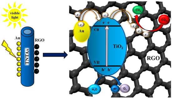 As illustrated in Figure 10, when the ternary RGO/Au-TNTAs photocatalyst is irradiated with visible light, the light photons are absorbed by the Au NPs as a result of the LSPR effect as shown in Equation (2). The photo-induced electrons in Au are injected into the CB of TNTAs as demonstrated in Equation (3). The electrons (e−) are then transported from the TNTAs CB to the RGO (Equation (4)), the RGO is serving as an electron reservoir by receiving the electrons from TNTAs CB, in addition to its ability in improving the absorption of visible light, owing to its dark color. The electrons cloud on the RGO reacts with the CO2 molecules while the holes (h+) at the TNTAs VB oxidize water to produce hydrogen free radicals (H+) which then react with the CO2 to form CH4 after a series of redox reactions as shown in Equations (5) and (6). The synergetic effect of Au NPs and RGO nanosheets prolonged the lifetime of electrons, enhanced visible light absorption, and increased the surface area for higher CO2 adsorption on the photocatalysts surface and thus improving the photocatalytic performance over the RGO-Au-TNTAs composite [79,80].