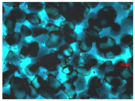 All samples were subjected to a set binder saturation of 20%, given that this factor considerably impacts the strength properties of the printed sandstones [6,16]. Binder saturation refers to the volume of binder occupying the pore space. To achieve full strength, the 3D-printed sandstones were thermally cured at 80 °C for 24 h. This step helped to reduce the moisture in the samples resulting from the polymerization reaction between the binder and the activator [6,20]. The polymerization is an exothermic reaction that releases energy in the form of heat and creates the bonds or binder necks between the sand particles. Figure 2 displays the grain morphology of the 3D-printed sandstone under UV light at high magnification. The binder necks between sand particles are identified by the darker regions, while the porous space appears in areas back-filled with fluorescent epoxy (gradient blue). Further descriptions of the 3D-printing process can be found in previous studies [6,9,11,16].