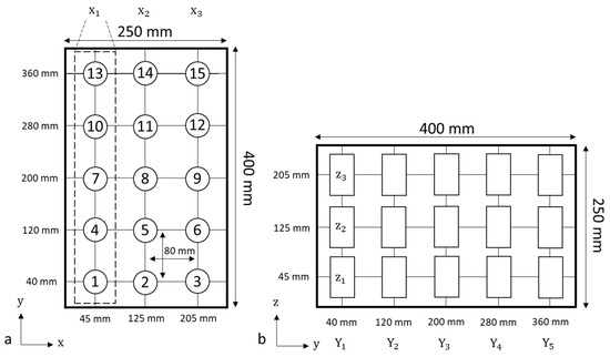 Distribution of 3D-printed samples in the M-FlexTM 3D printer build volume: (a) top view illustrating the x-y plane distribution, and (b) lateral view demonstrating the layered elevation (z-axis) distribution.