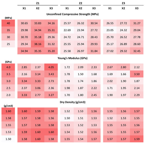To develop a deeper understanding of the variability observed during 3D printing, the experimental results were divided into distinct groups drawn from the entire population of samples. Figure 6 illustrates the mechanical properties of the 3D-printed samples, highlighting their variability across the build platform area, with color intensity representing variation in magnitude. The samples were divided by their level in the build volume (platform elevation, denoted as z1, z2, and z3). Subsequently, each level was discretized to represent the left (x1), center (x2), and right (x3) sections of the powder bed. This categorization enabled the identification of areas where significant changes were observed.
