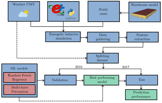 A physics-based co-simulation utilizing EnergyPlus V9.4 [42] and its Python API [43] was conducted to simulate the penalty-aware electricity consumption of the warehouse during a flexibility event. Simulations were performed with a sub-hourly resolution of four timestamps per hour (15 min intervals) during the summer cooling season (from mid-May to the middle of September) of two consecutive simulated years. Simulations were executed using the weather conditions of Climatic Zone 3B, California (LA). The weather file for the exact location was converted from the typical meteorological year (TMY) weather file into the current meteorological year (CMY) for 2016 and 2017 using the diyepw tool [44]. This is to ensure the reliability and feasibility of the validation and testing approach and to deploy the expanding window method similar to real-world scenarios. The choice of California as the location of the simulated buildings was firstly motivated by the fact that the flexibility simulation is performed for the cooling systems, which can be implemented in moderately warm areas (the implementation in cold regions is not feasible due to the non-existing/low cooling load, while the implementation in extremely warm/hot areas (e.g., middle east) is not possible as it will result in low durations of flexibility measures). Secondly, the emergency load reduction program of California State [45] is an established demand response program, and the specifications of the performed predictions (up to 5 h) have been partially inspired based on this existing program.