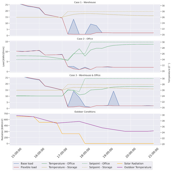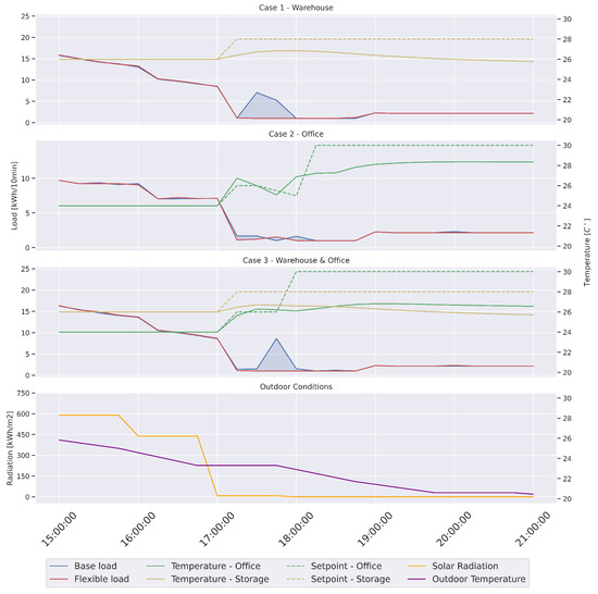 As explained in Section 2.2, flexibility events are simulated in a warehouse building through cooling setpoint adjustments for three different cooling scenarios. Figure 3 presents the energetic behavior of the investigated cases under moderate environmental conditions. As previously stated, the offices’ schedule terminates the cooling load at 18:00, which is why the cooling setpoint increases to 30 C. A comparison of the first and third cases clearly demonstrates that the cooling load of the storage spaces significantly exceeds that of the offices. The flexibility provided by the office lasts for a short time, as the temperature in thte offices quickly exceeds the threshold after 15 min. However, also providing cooling in the storage spaces, as in case 3, extends this duration, and the temperature increase in the offices remains within the accepted threshold for 45 min, followed by the conclusion of the working hours in the office.