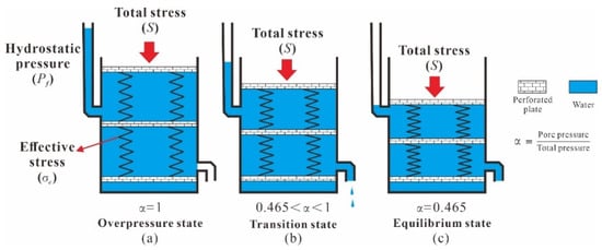 The term “effective stress” was originally used in soil mechanics to denote the contact stress (or support stress) between soil particles. Terzaghi (1923) proposed the concept of effective stress based on research on the mechanical characteristics of water-saturated soil [31], assuming that the effective stress (σe) is equal to the difference between the overburden pressure (S) and the pore pressure (Pf):