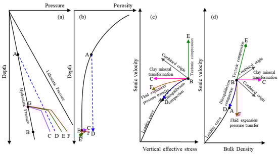 Depth–pressure, depth–porosity, sonic velocity–vertical effective stress, and sonic velocity–density diagrams for identifying the origins of overpressure [5,15]. “A” is the disequilibrium compaction; GB (black curve) is the normal compaction pore pressure curve; GC and BC (pink curve) form the overpressure curve resulting from clay mineral transformation; AD and BD (blue dashed line) are the overpressure curve occurring due to disequilibrium compaction; GE and BE (green curve) form the overpressure curve resulting from tectonic compression; GF and BF (red curve) form the overpressure curve occurring because of pressure transfer including hydrocarbon generation. (a) Relationship between pressure of different origins and depth; (b) characteristics of porosity changes caused by pressure of different origin; (c) influence of pressure from different origins on the relationship between sonic velocity and vertical effective stress; (d) influence of pressure from different origins on the relationship between sonic velocity and bulk density.