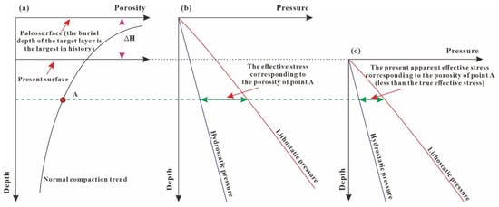 Schematic diagram of denudation thickness correction in pressure prediction. (a) At present, point A is not the largest buried depth in history; (b) under normal compaction, porosity at point A is formed at the historical maximum buried depth, which corresponds to a large effective stress; (c) if no denudation is taken into account, the point where the effective stress is zero will be taken to the present surface, and the present effective stress at point A is insufficient to cause the observed porosity value, which results in overestimation of pore pressure at that point.