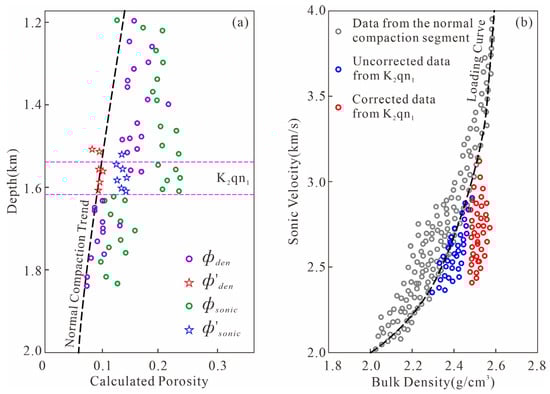 Before correction, the density porosity and sonic porosity of K2qn1 deviated significantly from the NCT, and the deviation amplitude of the sonic porosity was much larger than that of the density porosity (Figure 6a). When discussing the origin of overpressure in the Baram Basin, Tingay (2009) pointed out that this phenomenon reflected the existence of overpressure caused by disequilibrium compaction [12]. In the sonic velocity–density cross plot, the uncorrected intersection points are close to the NCT (Figure 6b), which also shows the characteristics of overpressure caused by disequilibrium compaction.