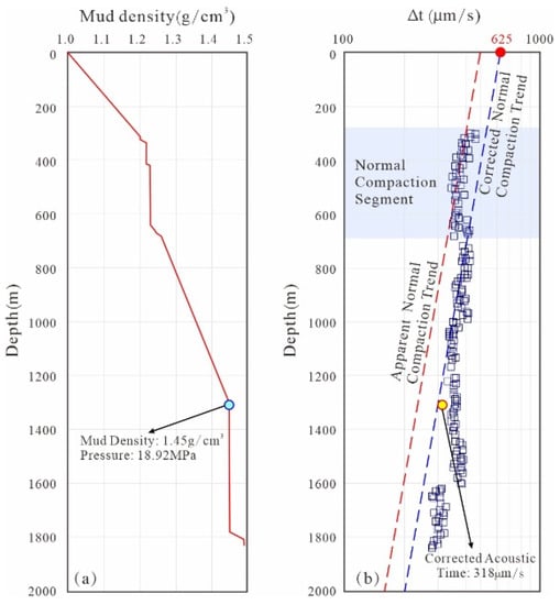 The essence of the “equivalent depth method” is the corresponding depth associated with a certain porosity in the NCT. According to Equation (4), the equivalent depth corresponding to a certain sonic time difference (Δt) can be expressed as