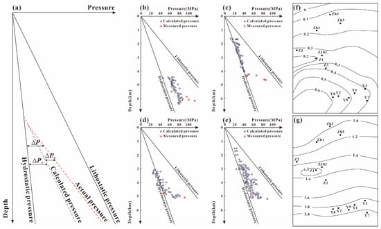 Example of pressure prediction based on genetic compensation in southern Junggar Basin [46]. (a) is the decomposition diagram of overpressure origins. (b–e) are the calculated and measured pressure of Y1, Zh1, Z101 and Z1 wells, respectively. (f) is the isogram of additional pressure coefficient formed by lateral loading in Jurassic top. (g) is the isogram of the predicted pressure coefficient in Jurassic top.
