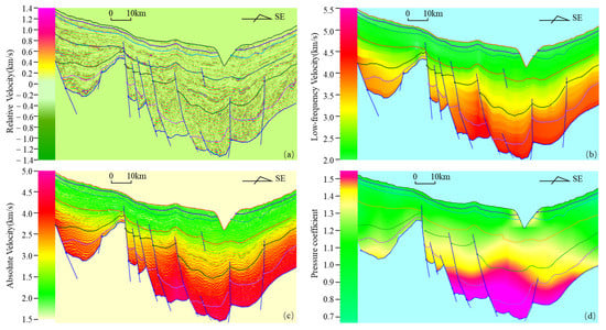 To solve the problem of seismic data quality, Guo et al. (2012) proposed a complete set of seismic velocity processing methods [41]. Seismic data have a certain frequency range, mainly containing intermediate frequency information but missing low-frequency information. To extract formation velocity using the seismic data, it is necessary to compensate for the low-frequency velocity component and solve the problem of velocity component superposition at different frequencies. A low-frequency velocity model was established using seismic velocity spectrum data, and the relative velocity was extracted from the seismic data using the colored inversion method [42]. The superposition of these two velocity components can be used to produce high-quality absolute seismic velocity.
