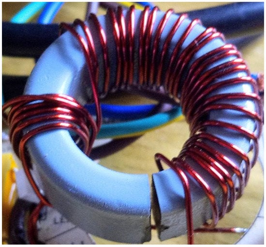 - Eroglu, A. Complete Modeling of Toroidal Inductors for High Power RF Applications. IEEE Trans. Magn. 2012, 48, 4526–4529. [Google Scholar] [CrossRef]