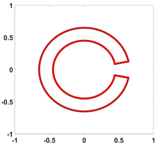 The original and reconstructed boundaries are shown in Figure 4 and Figure 5. The curve is smoothed by the zero-padded inverse DFT method, so theoretically, the problem can be solved accurately. The example shown is the boundary for the grid of 256 × 256, the number of points is filled from 288 to 440, and 440 is the boundary number suitable for a 256 × 256 grid calculated based on the arc length to make sure there is only one point in one element of the mesh grid.
