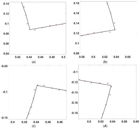 The zoomed-in images of the reconstructed boundary and original boundary near the sharp corners: (a) upper left corner; (b) upper right corner; (c) lower left corner; (d) lower right corner.