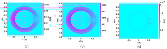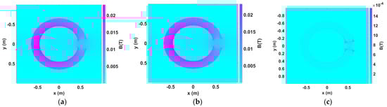 Flux density results comparison between KFBIM for the reconstructed boundary and FEM for the original boundary in 3D for Example 1: (a) Flux density (T) of the reconstructed C-core problem (KFBIM) (256 × 256); (b) Flux density (T) of the original C-core problem (FEM) (268,535 elements); (c) Difference of flux density (T) between FEM and KFBIM.