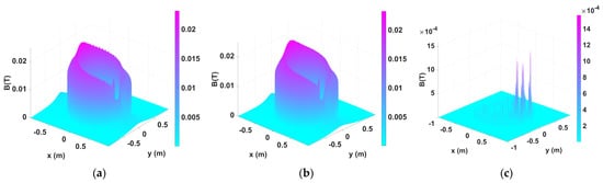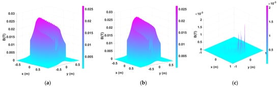 Flux density results comparison between KFBIM for the reconstructed boundary and FEM for the original boundary in 3D for Example 2: (a) Flux density (T) of the reconstructed C-core problem (KFBIM) (256 × 256); (b) Flux density (T) of the original C-core problem (FEM) (268,535 elements); (c) Difference of flux density (T) between FEM and KFBIM.