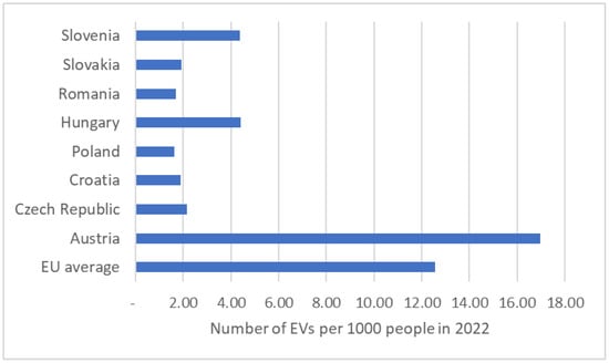It is clear that Poland has the lowest EV fleet in terms of both vehicle-proportional and population-proportional data. With regard to Poland, however, it has to be noted that the proportion of alternatively powered vehicles is particularly high there due to the high number and share of LPG-powered cars. Overall, there are 3.1 million registered LPG vehicles in Poland, and the number is constantly increasing [10,11,156,157]. Studying the eight countries together, there is an average of 4.38 EVs per 1000 people. The lag of the studied countries becomes even more pronounced if we do not take into account Austria (as it is an outlier country in all respects) and look at the average of the 7 countries. In this case, the indicator is 2.58 EVs per 1000 people, compared to the EU average of 12.56 EVs per 1000 people.