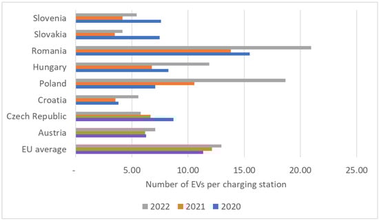 At the level of the eight Central European countries discussed in the present analysis [179,180,181], significant differences can be observed in the ratio of charging points to EVs (Figure 2) based on EAFO data. For comparison, the average data of the EU27 were included in the study, thus, the results could be interpreted in a broader context. Strikingly, in 2022, Slovakia [182], Slovenia, Croatia [183,184], the Czech Republic [185,186,187], Austria [188,189], and Hungary will have better ratios than the EU average. The two countries with the largest territorial size and population, Poland [190] and Romania [191,192,193], are lagging significantly behind. However, the standard deviation of the values is significant, with extremes of 3.87 (Slovakia) and 19.17 (Romania). Between 2020 and 2022, the number of charging points compared to EVs increased most intensively in Slovakia, the Czech Republic, and Slovenia, with a minimal decrease in Austria, the EU average, and Croatia, while in the case of Hungary and mainly Romania and Poland, the ratio deteriorated significantly.