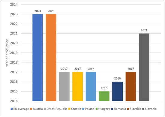 The manufacture year of EV, which can be purchased with an average income over a time unit in the studied member states. Source: Own editing based on data of used car websites [57,58,59,60,61,62,63,64,65,66,67,68,69,70,71,72,73,74,75,76,77,78,79,80], official websites of manufacturers [82,83,84,85,86,87,88,89,90,91,92,93,94,95,96,97,98,99,100,101,102,103,104,105,106,107,108,109,110,111,112,113,114,115,116,117,118,119,120,121,122,123,124,125,126,127,128,129,130,131,132,133,134,135,136,137,138,139,140,141,142,143,144,145,146] and EUROSTAT [198].