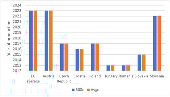 The manufacture year of Fiat 500e and Toyota Aygo, which can be purchased with an average income over a time unit in the studied member states. Source: own editing based on data of used car websites [57,58,59,60,61,62,63,64,65,66,67,68,69,70,71,72,73,74,75,76,77,78,79,80], official websites of manufacturers [82,83,84,85,86,87,88,89,139,140,141,142,143,144,145,146] and EUROSTAT [198].