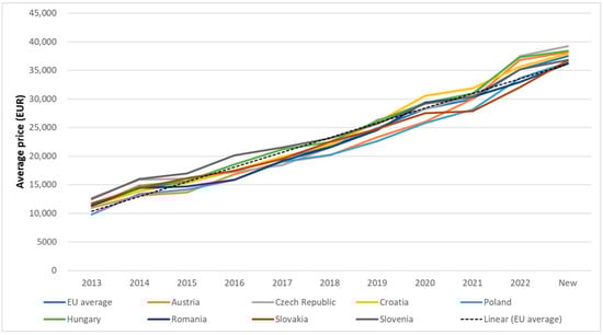 Basically, several studies have already been carried out on the spread of electromobility in certain regions of the world, such as the EU, USA, and Japan. All of them point out that the spread of electromobility is strongly influenced by, among others, economic development and purchasing power [23,24,25]. Therefore, as new prices for high-end cars in the CEE region are difficult to reconcile with the purchasing power of average income earners, these are not part of the study [26,27,28,29,30,31]. The reasons for this include, among others, high unemployment rates in countries of the CEE region, infrastructural underdevelopment, migration of the population, low salaries, etc. [32]. Nothing illustrates the above statement better than the fact that, according to ACEA data, the average age of EU cars is 11.5 years, the average age of cars in Poland is 14.1 years, and in Croatia, it is 14.6 years. By contrast, cars in Slovenia are 11.7 years old on average, which is due to higher average salaries [21,33].