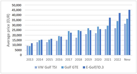 The average price of the three differently powered Volkswagen Golf by the manufacture year of the models. Data source: Used car websites [57,58,59,60,61,62,63,64,65,66,67,68,69,70,71,72,73,74,75,76,77,78,79,80], official websites of the manufacturer [98,99,100,101,102,103,104,105], authors’ own editing.