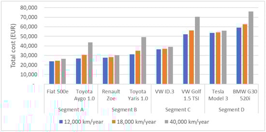 As expected, EVs proved to be more cost-effective than their direct competitors in all four segments studied, even at the lowest mileage (Figure 8). For seven years of use, this means a cost difference of about 3000–16,000 euros. Somewhat surprisingly, segment C registered the maximum, but even in the case of the high-end Tesla, the cost margin is larger in absolute terms than between segments A and B. As the mileage increases, the efficiency of EVs increases further compared to their competitors, with the VW ID3 reaching its maximum at 40,000 km (>31,000 euros), while the difference between other segments is reduced to a negligible level of 17,000–20,000 euros (i.e., a 3000 euro difference).