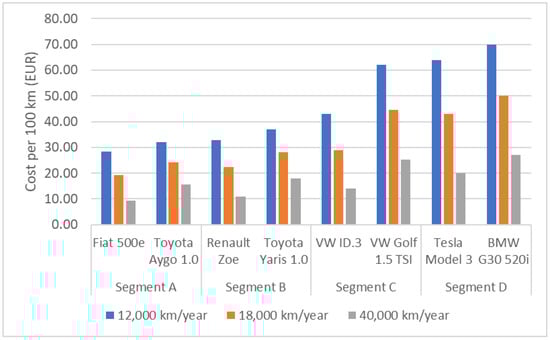 Figure 9 illustrates the total cost of ownership of 100 km in relation to a full seven-year cycle, considering different mileage levels. EV is again the most economical way to move, with cost developments showing a linear decline. Based on the results of the EAFO calculator [147], the scale ranges from 18–64 euros for 12,000 km, 19–43 euros for 18,000 km, and finally, 920 euros for the maximum of 40,000 km. In all cases, EVs in the cheaper segments proved to be more cost-effective compared to each other.