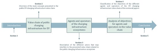 This review paper is organized as follows (Figure 1): Section 2 introduces the value chain considering the different actors in the system that can interfere with a brief description of each of them. Thus, it gives an overview of the main concepts presented in this approach. Section 3 describes what is considered an agent and an operator in the presented value chain related to the charging infrastructure ecosystem. Therefore, it describes for each agent and operator the different actors that may be involved, as well as a description of what objectives they may pursue typically included in the different studies analyzed. The particular objective of the different agents and operators that may intervene in the EV charging infrastructure value chain, which may vary according to the particular requirements of the operation or planning, are described in Section 4. Finally, Section 5 summarizes the electric vehicle charging infrastructure ecosystem, identifying and analyzing the main research findings.