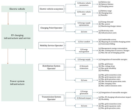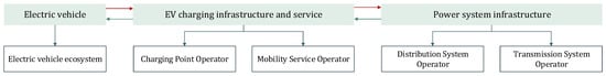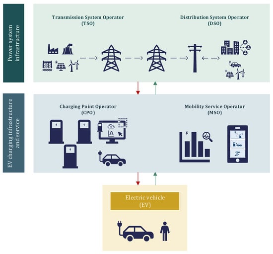 The identified actors involved in the EV charging infrastructure are described here as agents or operators. Considering the power system infrastructure and, more specifically, in the electricity market environment, an agent can be defined as any individual or legal entity that is involved in economic transactions that occur in the electric power market by purchasing or selling electric power, such as producers of electricity, retailers, and direct consumers on the market [16]. Additionally, like the transmission system, the distribution system, or the electricity market, an operator can be viewed as a system manager of a complex system. As part of the overall energy system, operators typically have legally defined functions and obligations. For instance, the market operator acts as a neutral party between buyers and sellers, accepting bids to purchase and sell energy and settling the results of matching processes in the day-ahead and intraday markets [16].