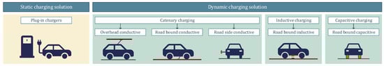 - Road-bound inductive: the energy of the charging solution is transmitted from the road to the vehicle without the need for a conductive connection by using two sets of coils, primary (installed on the road) and secondary (installed under the vehicle) [5,31,46,48].