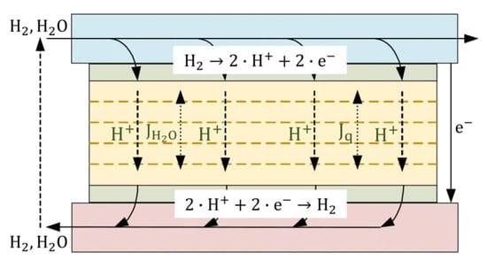 By applying this theory to the PEM-based TGC with two H2/H2O electrodes of different gas compositions and temperatures, the resulting fluxes of water, hydrogen ions, and heat inside the electrolyte can be described as: