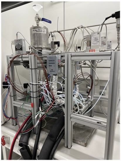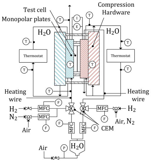 The membrane electrode assembly (MEA) of the TGC used in this work is composed of a stacked layer of four plain membranes and two membranes coated with catalyst ink (Pt/C + ionomer, ) of the type NafionTM N117 () with a surface area of 25 . The membranes consist of a polytetrafluoroethylene backbone with various perfluorinated-vinyl-polyether side chains, which contain sulphonic acid end groups providing mechanical strength and protonic conductivity, respectively [28]. The stacking of membranes is required to increase the thermal resistance of the MEA and to ensure a temperature gradient of up to to be maintained. The MEA is surrounded by two SIGRACET® 28BC gas diffusion layers, which, together with a teflon foil for sealing purposes, are pressed between the monopolar plates using LEANCAT compression hardware, ensuring homogeneous pressure over the entire sample cell. The pressure on the active area of the TGC is held constant at . The stainless steel monopolar plates (X6DrNiTi 1810) have a serpentine flow field (FF) and through-holes, which are connected to LAUDA thermostats pumping temperature-controlled water for heating or cooling purposes through the plates. For the conditioning of the gas flow, a Controlled Evaporation Mixing (CEM) System by Bronkhorst is used for each electrode, which consists of a liquid flow controller, a gas mass flow controller (MFC), and an evaporation device. There is one MFC for hydrogen (purity 5.0) implemented on the cathodic site, and two MFCs are used on the anodic site, one for hydrogen (purity 5.0) and the other for nitrogen (purity 5.0). This gives the opportunity to set up a temperature gradient between the electrodes while suppressing the gradient in chemical potential of the water solved in the membrane and the partial pressure of the hydrogen, which also effects the open circuit voltage (see Equation (6)). The gas is humidified with deionized water (. Controllable heating wires are implemented in the tubes between the outlet of the CEM and the inlet of the monopolar plates in order to avoid condensation of the water vapor in the gas stream. The schematic design of the test setup is shown in Figure 2.