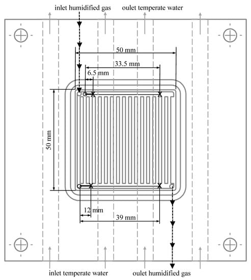 Different sensors monitor the temperature across the setup. To measure the temperature of the gas stream at the inlet and outlet of the plates, PT100 is used. Thermocouples type K detect the temperature of the monopolar plates, the heating wire, and the water temperature for heating and cooling the thermostats. Thermocouples of type T with a diameter of are implemented inside the flow field to measure the temperature distribution inside the cell without impacting the cell’s operation or internal processes. The location of the thermocouples inside the cell is shown in Figure 4.
