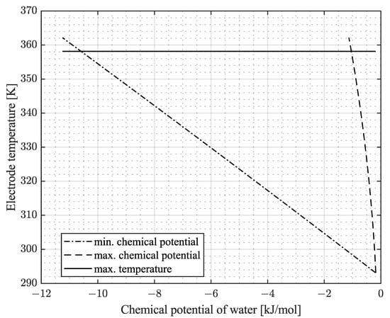 The cell voltage is measured with a NI9211 module from National Instruments. To determine internal cell resistances as well as the high frequency resistance (HFR) of the cell, which is needed to determine the coefficient , an electrochemical impedance device, the ModuLab XM CHAS 08 by SOLARTRON ANALYTICAL, is used. Figure 5 shows the possible range of measurement of our test setup in terms of electrode temperatures and the chemical potential of the water. The limit for the maximum temperature is set by the characteristics of the NafionTM membrane, which should not exceed 85 °C due to degradation reasons [29]. The range of the chemical potential of the water depends on the valid relative humidity of the gas stream, which affects the membrane water content. The minimum acceptable relative humidity is set to 5% to ensure hydrogen ion transport through the membrane, while the maximum relative humidity should not exceed 95% to avoid condensation of the water at potential cold spots in the setup [30].
